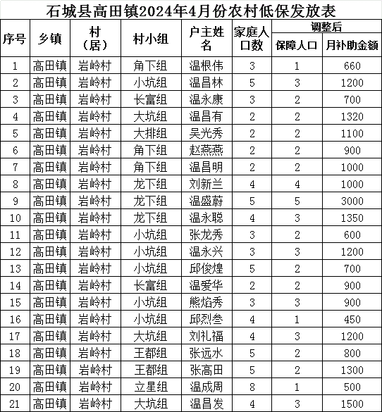 【最低生活保障】石城縣高田鎮(zhèn)巖嶺村2024年4月份農(nóng)村低保發(fā)放公示