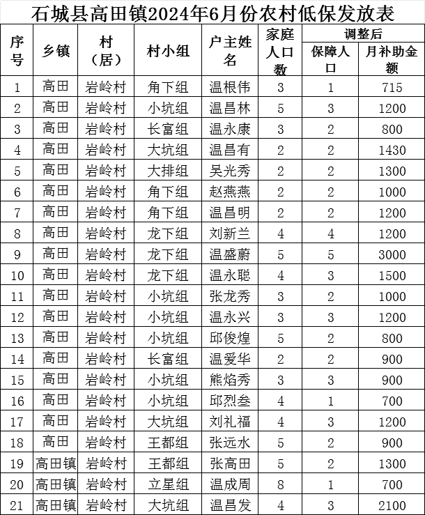 【最低生活保障】石城縣高田鎮(zhèn)巖嶺村2024年6月份農(nóng)村低保發(fā)放公示