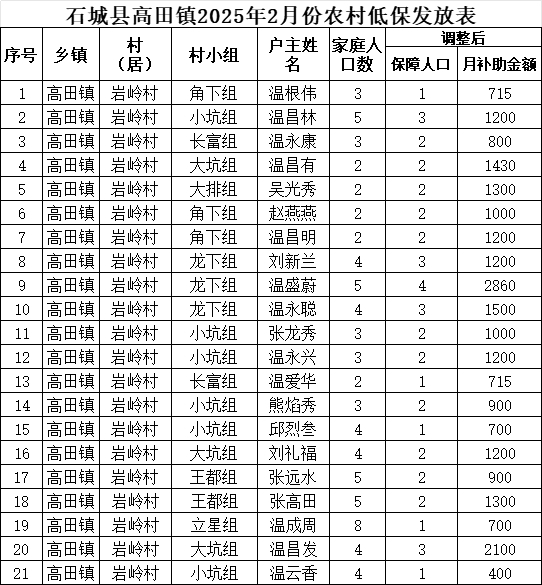 【最低生活保障】石城縣高田鎮(zhèn)巖嶺村2025年2月份農(nóng)村低保發(fā)放公示