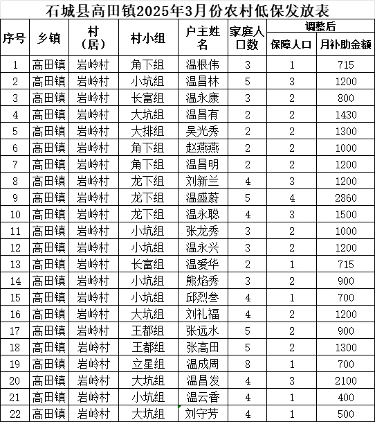 【最低生活保障】石城縣高田鎮(zhèn)巖嶺村2025年3月份農(nóng)村低保發(fā)放公示