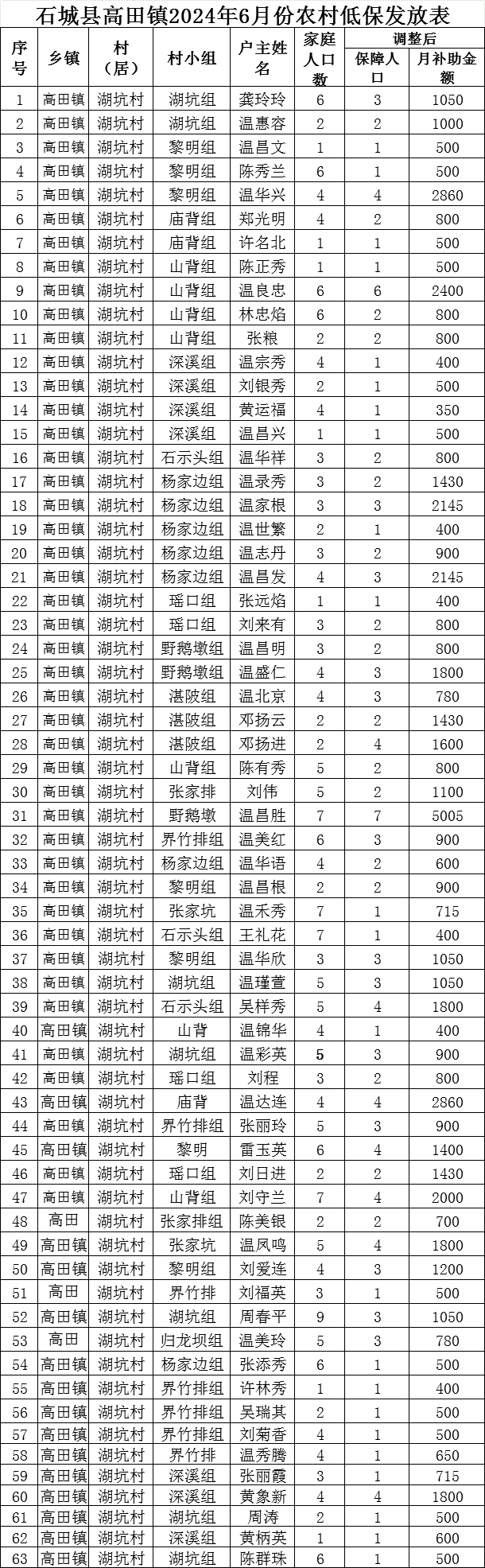 【最低生活保障】石城縣高田鎮(zhèn)湖坑村2024年6月份農(nóng)村低保發(fā)放公示