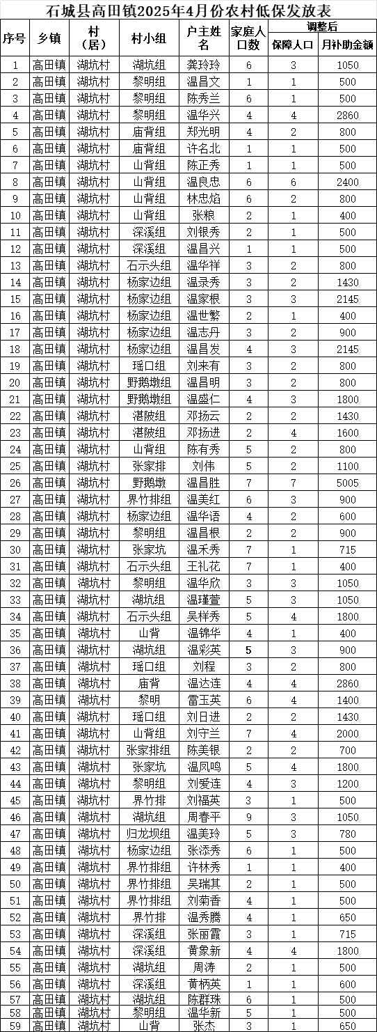 【最低生活保障】石城縣高田鎮(zhèn)湖坑村2025年4月份農(nóng)村低保發(fā)放公示