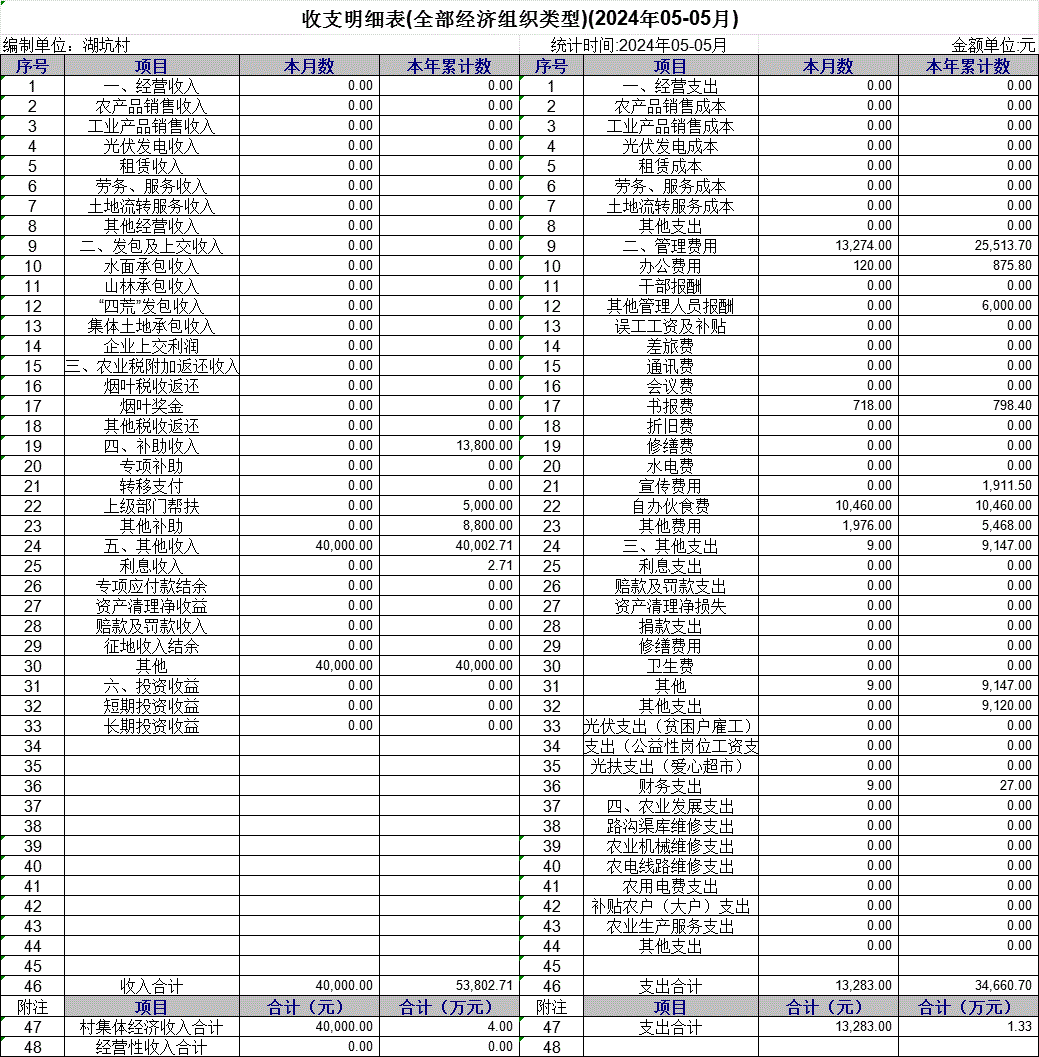 【村(社區(qū))財務收支狀況】高田鎮(zhèn)湖坑村2024年5月份財務收支狀況明細賬