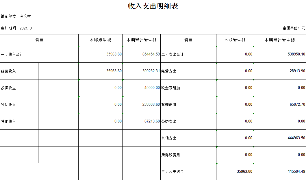 【村(社區(qū))財務收支狀況】高田鎮(zhèn)湖坑村2024年8月份財務收支狀況明細賬