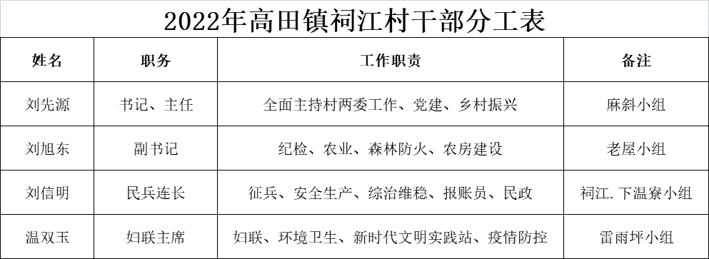 【村(居)委會(huì)成員信息】2022年高田鎮(zhèn)祠江村干部分工表