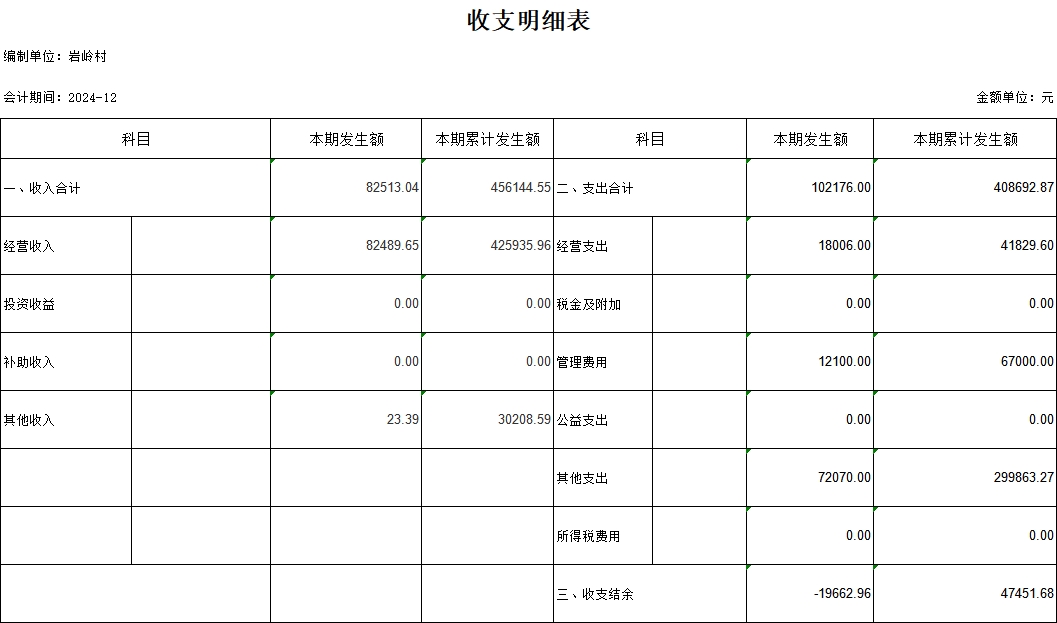 【村(社區(qū))財(cái)務(wù)收支狀況】高田鎮(zhèn)巖嶺村2024年12月份財(cái)務(wù)收支狀況明細(xì)賬