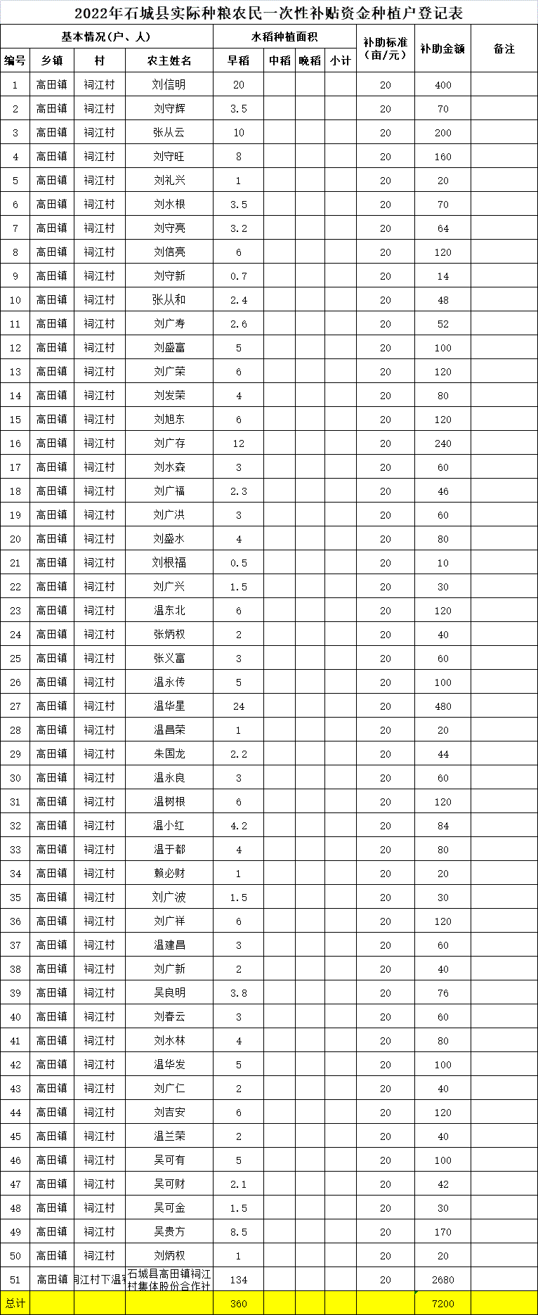 【涉農(nóng)補(bǔ)貼】2022年高田鎮(zhèn)祠江村實(shí)際種糧農(nóng)民一次性補(bǔ)貼資金種植戶(hù)登記表