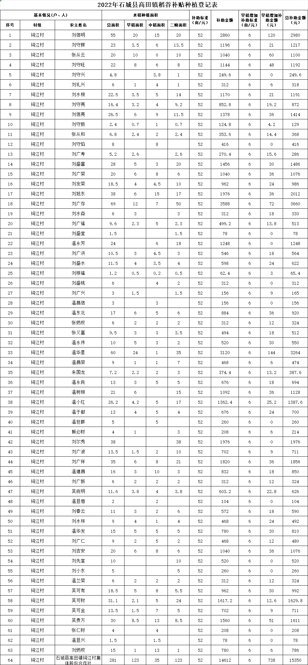 【涉農(nóng)補(bǔ)貼】2022年高田鎮(zhèn)祠江村稻谷補(bǔ)貼種植登記表
