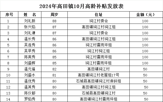 【老年人申領補貼和發(fā)放信息】2024年高田鎮(zhèn)祠江村10月高齡補貼發(fā)放表