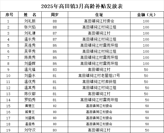 【老年人申領(lǐng)補(bǔ)貼和發(fā)放信息】2025年高田鎮(zhèn)祠江村3月高齡補(bǔ)貼發(fā)放表