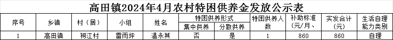 【特困人員救助供養(yǎng)】高田鎮(zhèn)祠江村2024年4月農(nóng)村特困供養(yǎng)金發(fā)放臺賬