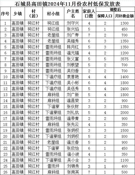 【最低生活保障】石城縣高田鎮(zhèn)祠江村2024年11月份農(nóng)村低保發(fā)放公示