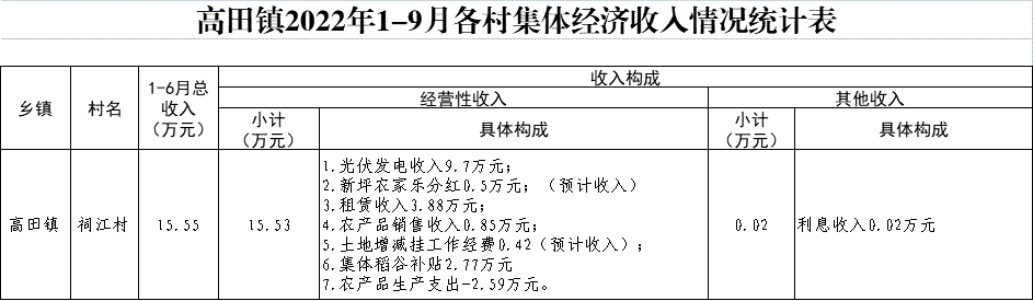 【集體統(tǒng)一經(jīng)營(yíng)的經(jīng)營(yíng)性資產(chǎn)】高田鎮(zhèn)祠江村2022年1-9月各村集體經(jīng)濟(jì)收入情況統(tǒng)計(jì)表