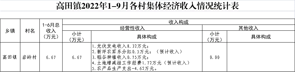 【集體統(tǒng)一經營的經營性資產】高田鎮(zhèn)巖嶺村2022年1-9月各村集體經濟收入情況統(tǒng)計表