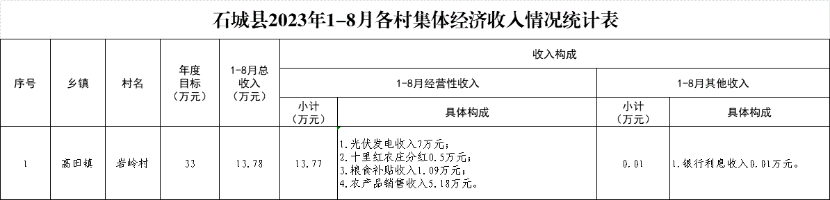 【集體統(tǒng)一經(jīng)營的經(jīng)營性資產(chǎn)】高田鎮(zhèn)巖嶺村2023年1-8月集體經(jīng)濟收入情況統(tǒng)計表