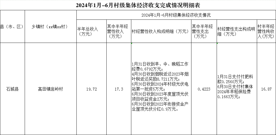 【集體統(tǒng)一經(jīng)營的經(jīng)營性資產(chǎn)】高田鎮(zhèn)巖嶺村2024年1-6月各村集體經(jīng)濟(jì)收入情況統(tǒng)計(jì)表