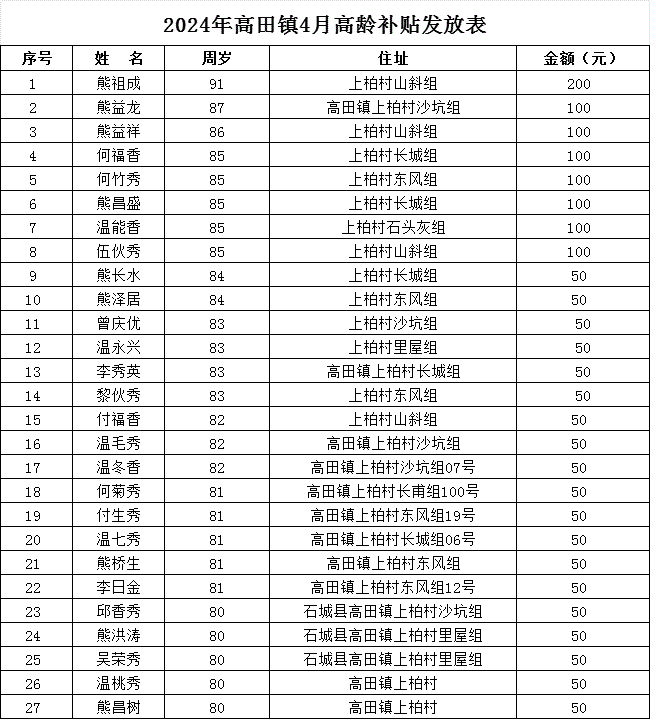 【老年人申領(lǐng)補貼和發(fā)放信息】2024年高田鎮(zhèn)上柏村4月高齡補貼發(fā)放表