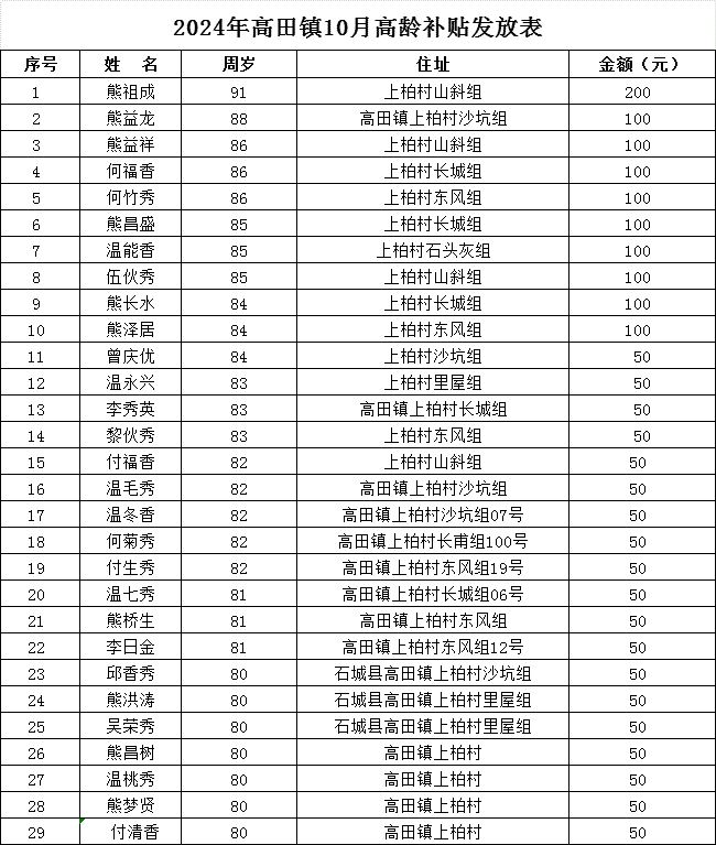 【老年人申領(lǐng)補(bǔ)貼和發(fā)放信息】2024年高田鎮(zhèn)上柏村10月高齡補(bǔ)貼發(fā)放表