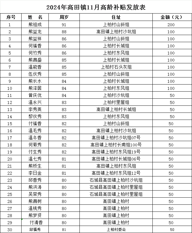 【老年人申領(lǐng)補貼和發(fā)放信息】2024年高田鎮(zhèn)上柏村11月高齡補貼發(fā)放表