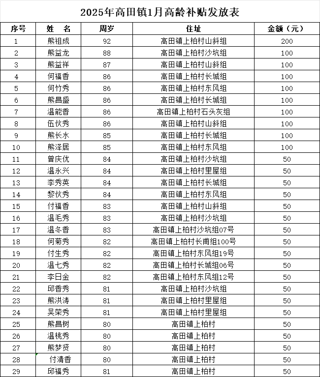 【老年人申領(lǐng)補(bǔ)貼和發(fā)放信息】2025年高田鎮(zhèn)上柏村1月高齡補(bǔ)貼發(fā)放表