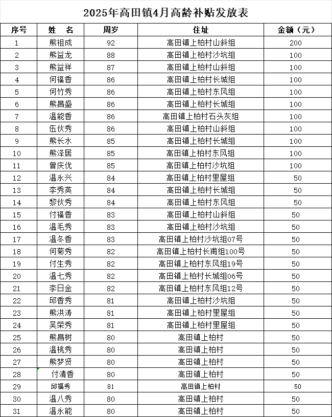 【老年人申領(lǐng)補(bǔ)貼和發(fā)放信息】2025年高田鎮(zhèn)上柏村4月高齡補(bǔ)貼發(fā)放表