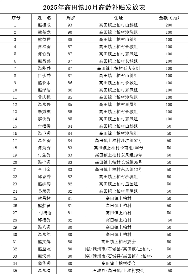 【老年人申領(lǐng)補(bǔ)貼和發(fā)放信息】2025年高田鎮(zhèn)上柏村10月高齡補(bǔ)貼發(fā)放表