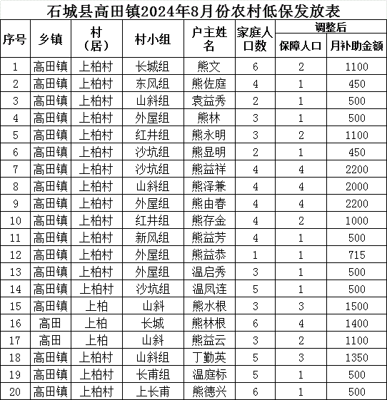 【最低生活保障】石城縣高田鎮(zhèn)上柏村2024年8月份農(nóng)村低保發(fā)放公示