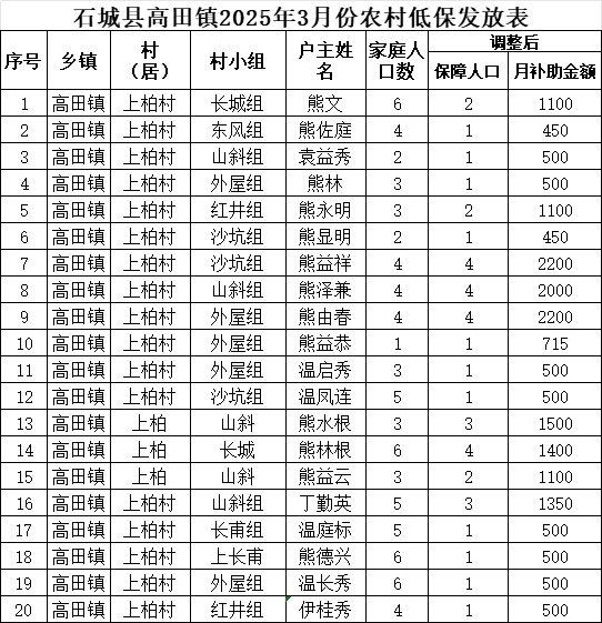 【最低生活保障】石城縣高田鎮(zhèn)上柏村2025年3月份農(nóng)村低保發(fā)放公示