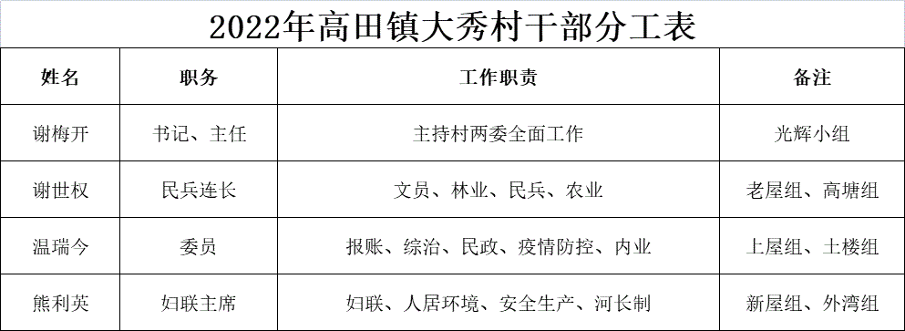 【村(居)委會成員信息】2022年高田鎮(zhèn)大秀村干部分工表