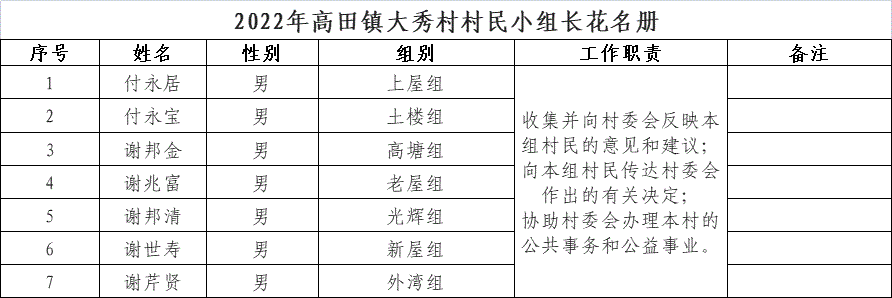 【其他人員信息】2022年高田鎮(zhèn)大秀村村民小組長(zhǎng)花名冊(cè)