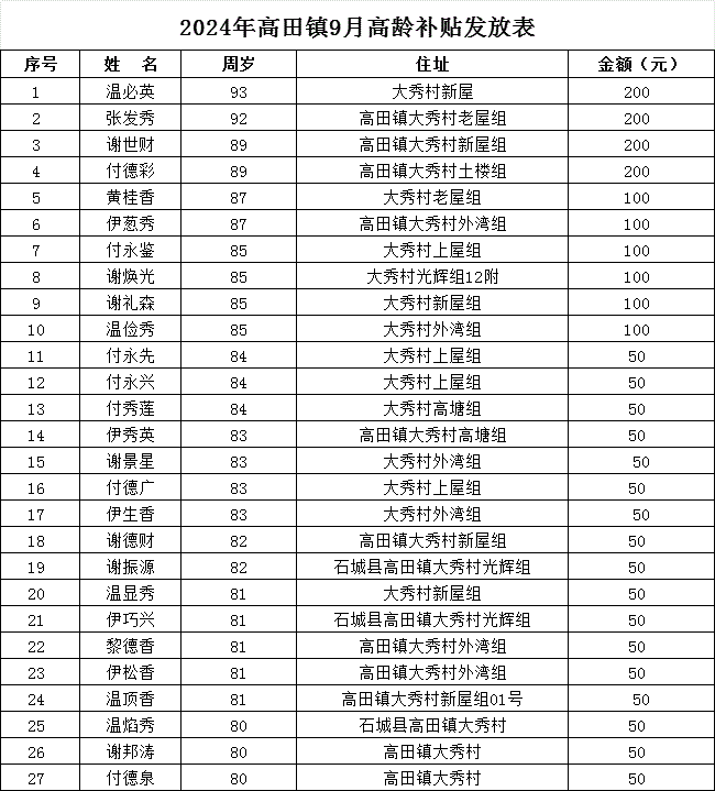 【老年人申領(lǐng)補(bǔ)貼和發(fā)放信息】2024年高田鎮(zhèn)大秀村9月高齡補(bǔ)貼發(fā)放表