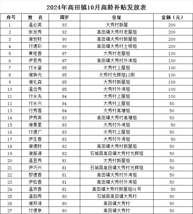 【老年人申領(lǐng)補貼和發(fā)放信息】2024年高田鎮(zhèn)大秀村10月高齡補貼發(fā)放表