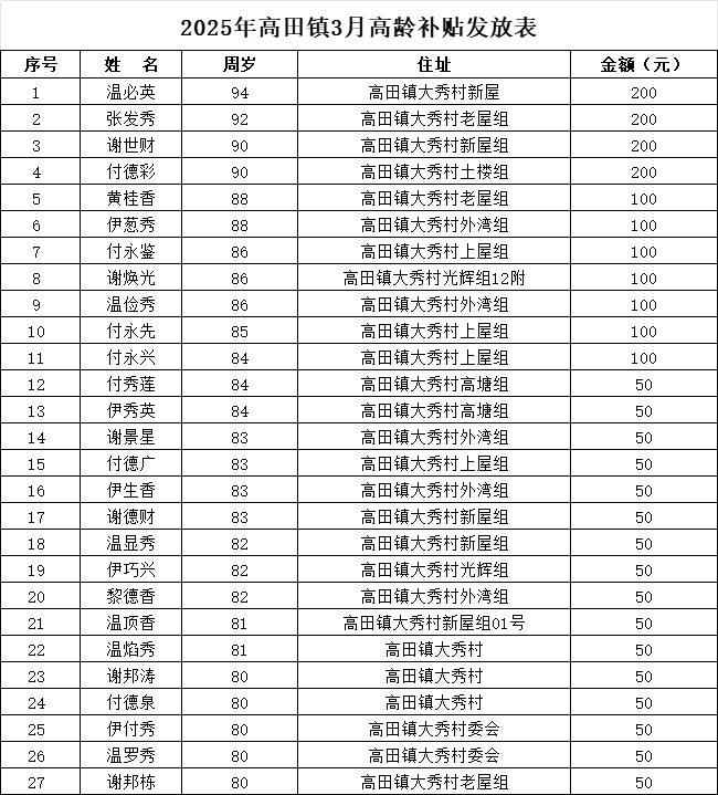 【老年人申領(lǐng)補(bǔ)貼和發(fā)放信息】2025年高田鎮(zhèn)大秀村3月高齡補(bǔ)貼發(fā)放表