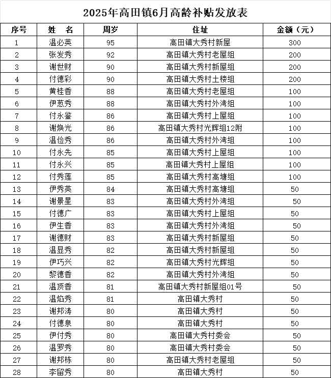 【老年人申領(lǐng)補(bǔ)貼和發(fā)放信息】2025年高田鎮(zhèn)大秀村6月高齡補(bǔ)貼發(fā)放表
