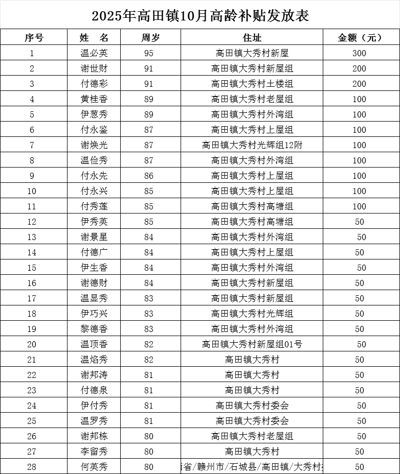 【老年人申領(lǐng)補(bǔ)貼和發(fā)放信息】2025年高田鎮(zhèn)大秀村10月高齡補(bǔ)貼發(fā)放表