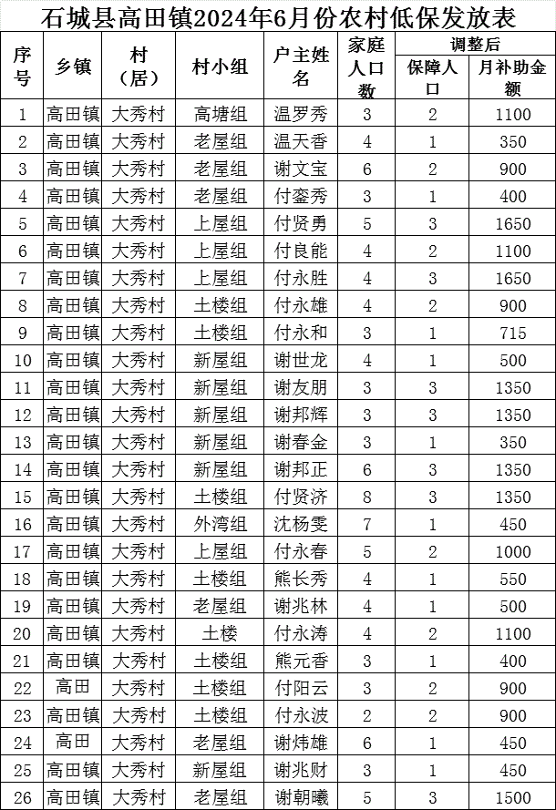 【最低生活保障】石城縣高田鎮(zhèn)大秀村2024年6月份農(nóng)村低保發(fā)放公示