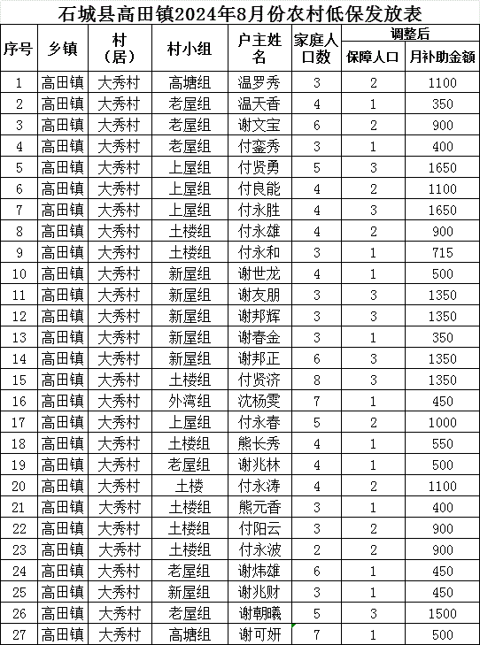 【最低生活保障】石城縣高田鎮(zhèn)大秀村2024年8月份農(nóng)村低保發(fā)放公示
