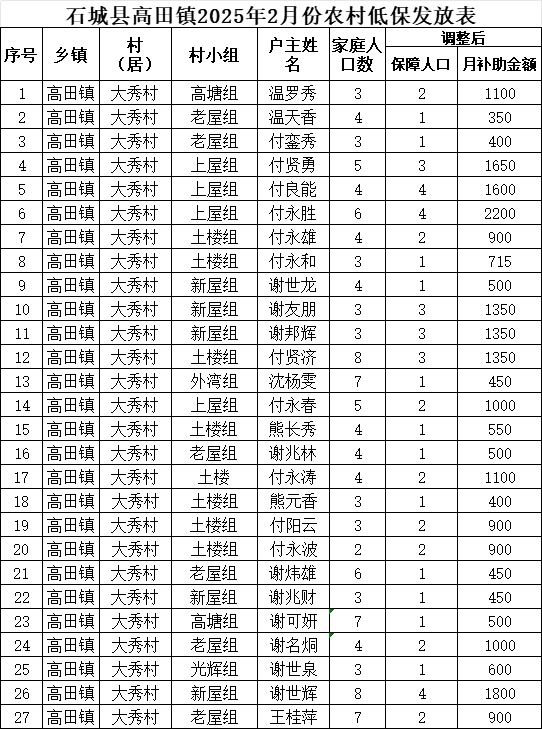 【最低生活保障】石城縣高田鎮(zhèn)大秀村2025年2月份農(nóng)村低保發(fā)放公示