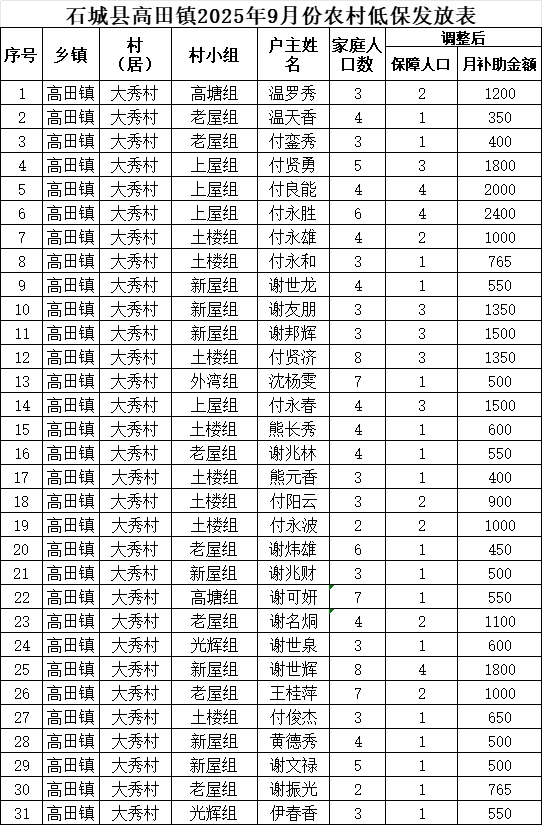 【最低生活保障】石城縣高田鎮(zhèn)大秀村2025年9月份農(nóng)村低保發(fā)放公示