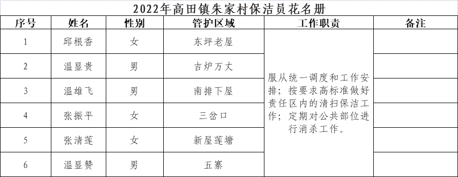 【其他人員信息】2022年高田鎮(zhèn)朱家村保潔員花名冊(cè)