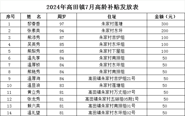 【老年人申領(lǐng)補(bǔ)貼和發(fā)放信息】2024年高田鎮(zhèn)朱家村7月高齡補(bǔ)貼發(fā)放表