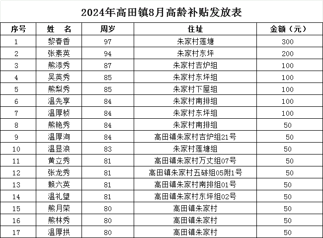 【老年人申領(lǐng)補(bǔ)貼和發(fā)放信息】2024年高田鎮(zhèn)朱家村8月高齡補(bǔ)貼發(fā)放表