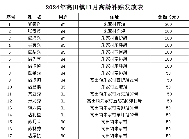 【老年人申領(lǐng)補貼和發(fā)放信息】2024年高田鎮(zhèn)朱家村11月高齡補貼發(fā)放表