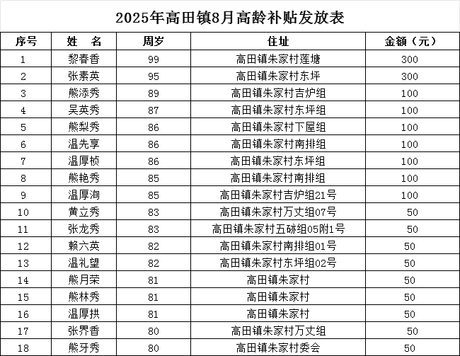 【老年人申領(lǐng)補貼和發(fā)放信息】2025年高田鎮(zhèn)朱家村8月高齡補貼發(fā)放表