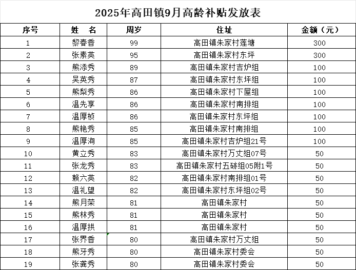 【老年人申領(lǐng)補(bǔ)貼和發(fā)放信息】2025年高田鎮(zhèn)朱家村9月高齡補(bǔ)貼發(fā)放表