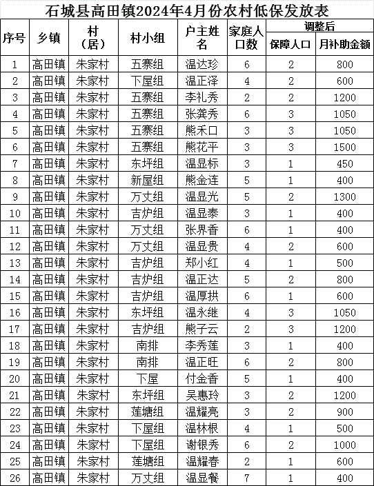 【最低生活保障】石城縣高田鎮(zhèn)朱家村2024年4月份農(nóng)村低保發(fā)放公示