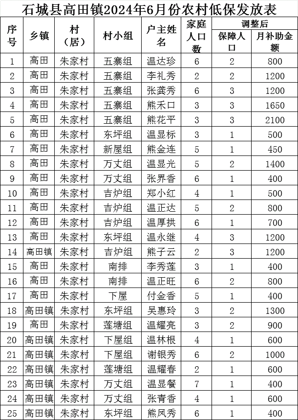 【最低生活保障】石城縣高田鎮(zhèn)朱家村2024年6月份農(nóng)村低保發(fā)放公示