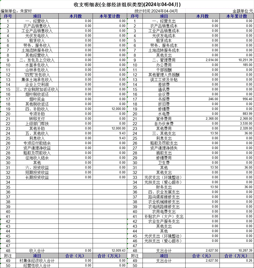 【村(社區(qū))財務(wù)收支狀況】高田鎮(zhèn)朱家村2024年4月份財務(wù)收支狀況明細賬