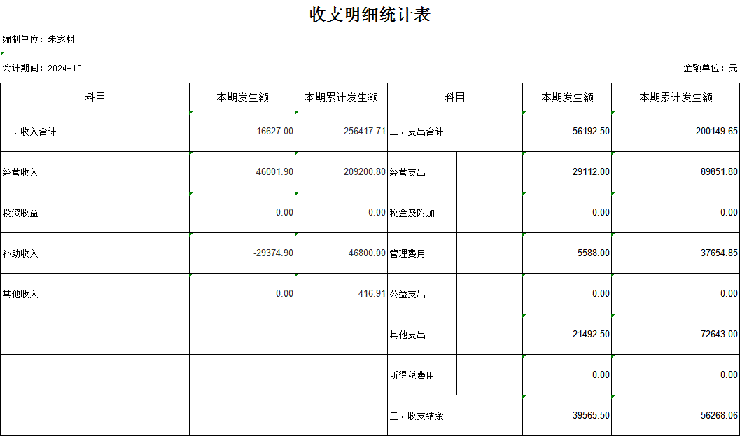 【村(社區(qū))財(cái)務(wù)收支狀況】高田鎮(zhèn)朱家村2024年10月份財(cái)務(wù)收支狀況明細(xì)賬