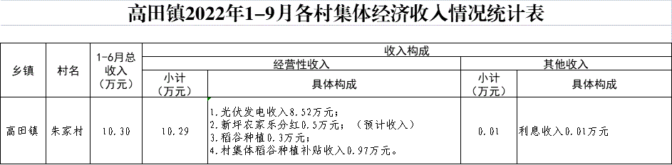 【集體統(tǒng)一經(jīng)營(yíng)的經(jīng)營(yíng)性資產(chǎn)】高田鎮(zhèn)朱家村2022年1-9月各村集體經(jīng)濟(jì)收入情況統(tǒng)計(jì)表